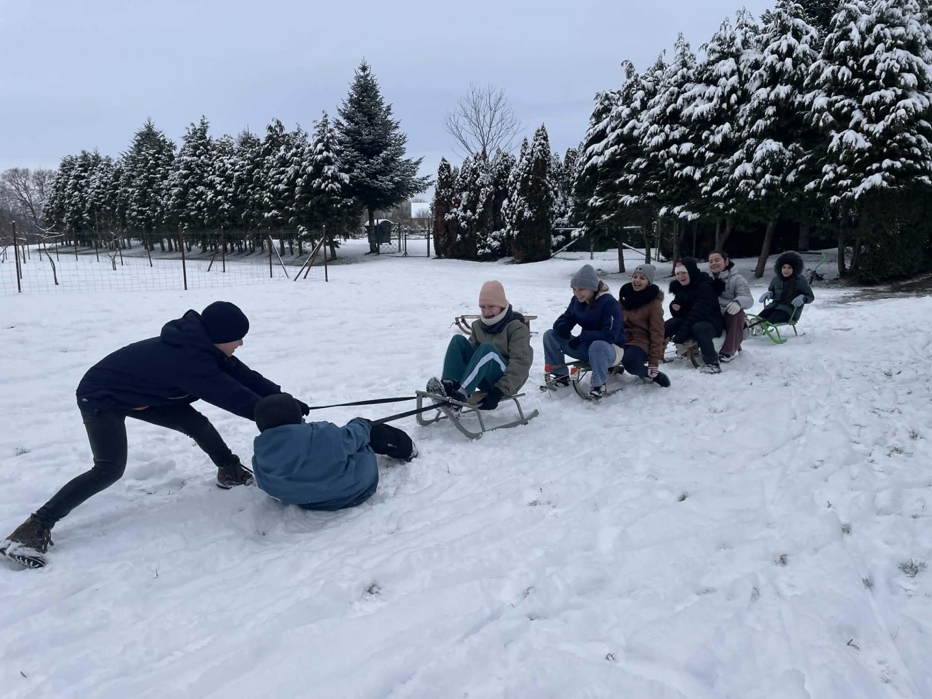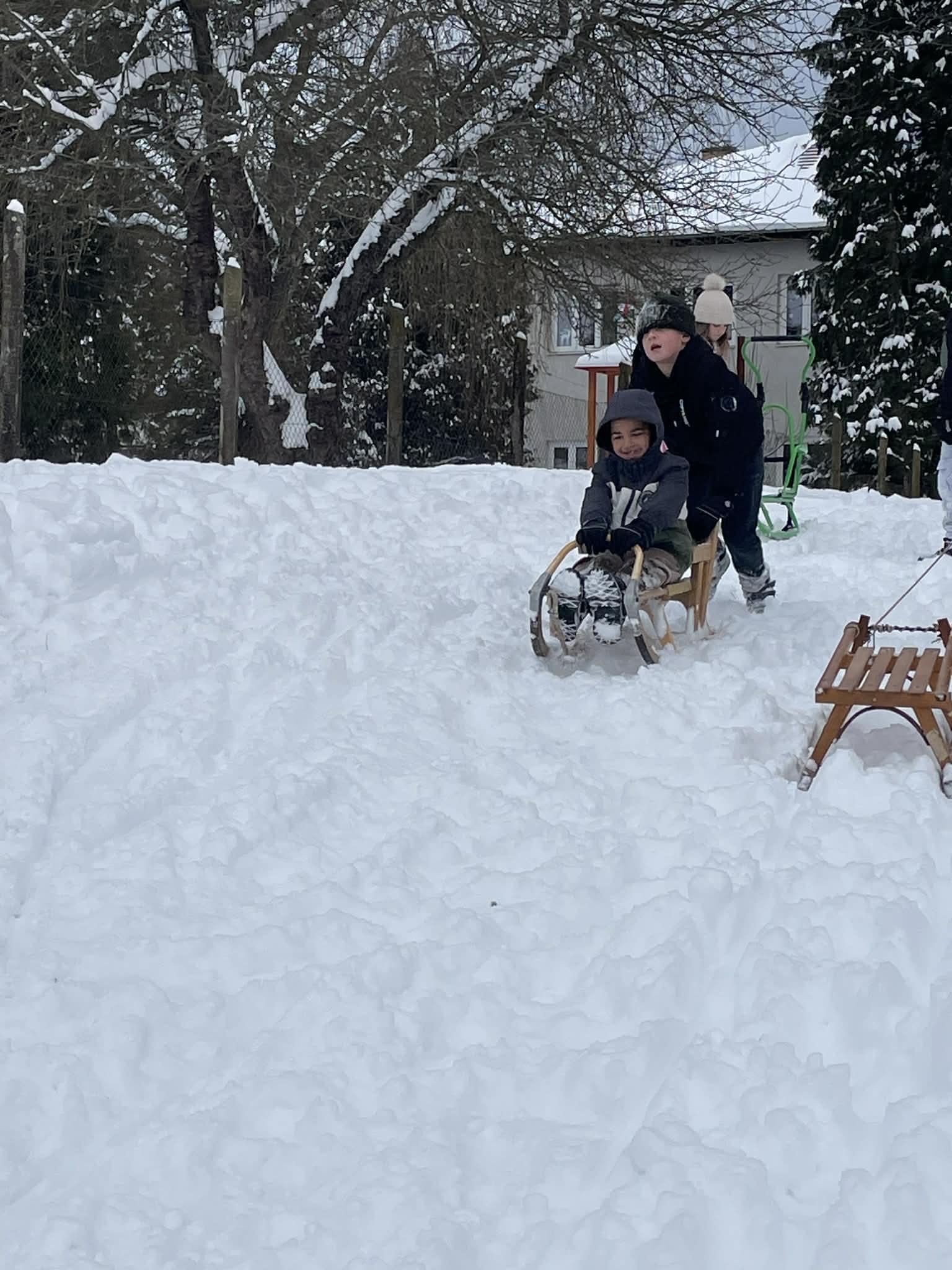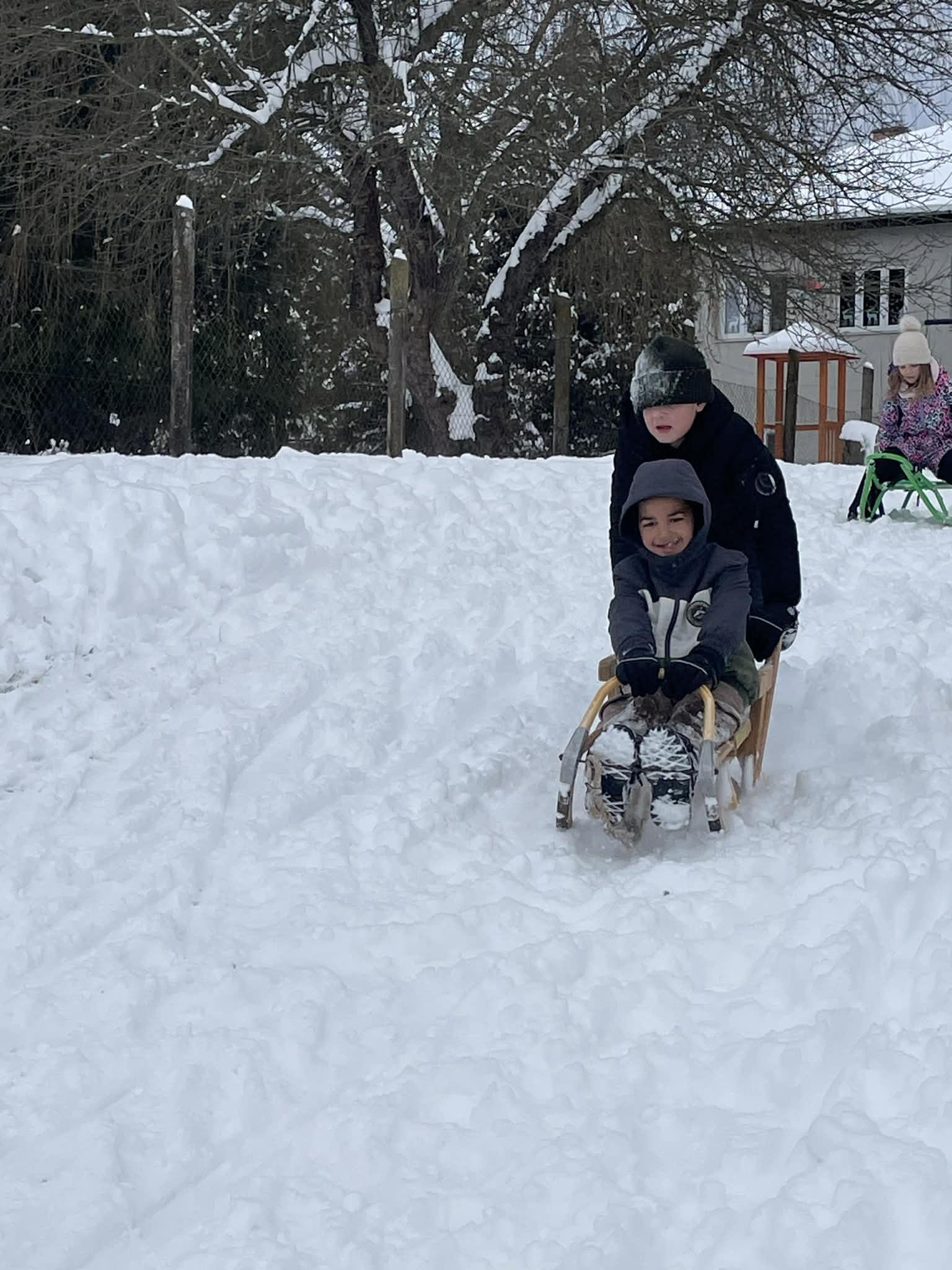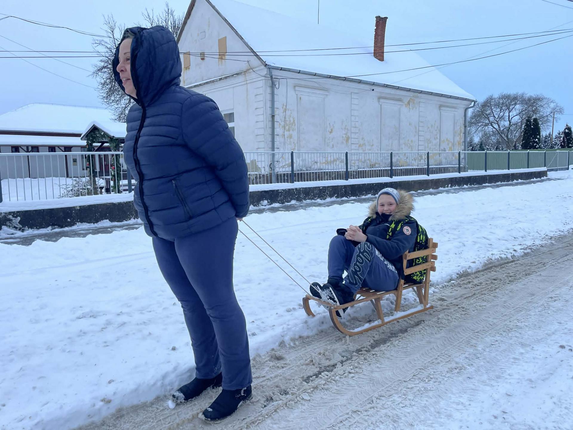 Többen szánkóval érkeztek iskolába, az épület előtt pedig már egy igazi „szánkópark” alakult ki. A leglelkesebbek még a hó eltakarításában is segédkeztek.